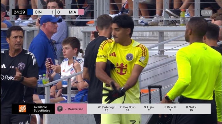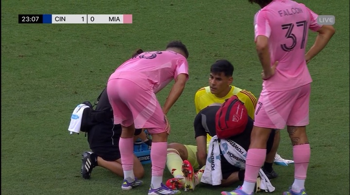 07月17日讯 美职联迈阿密国际客战辛辛那提FC。比赛第25分钟,迈阿密门将乌斯塔里出击拉伤,被替补门将诺沃替换下场。